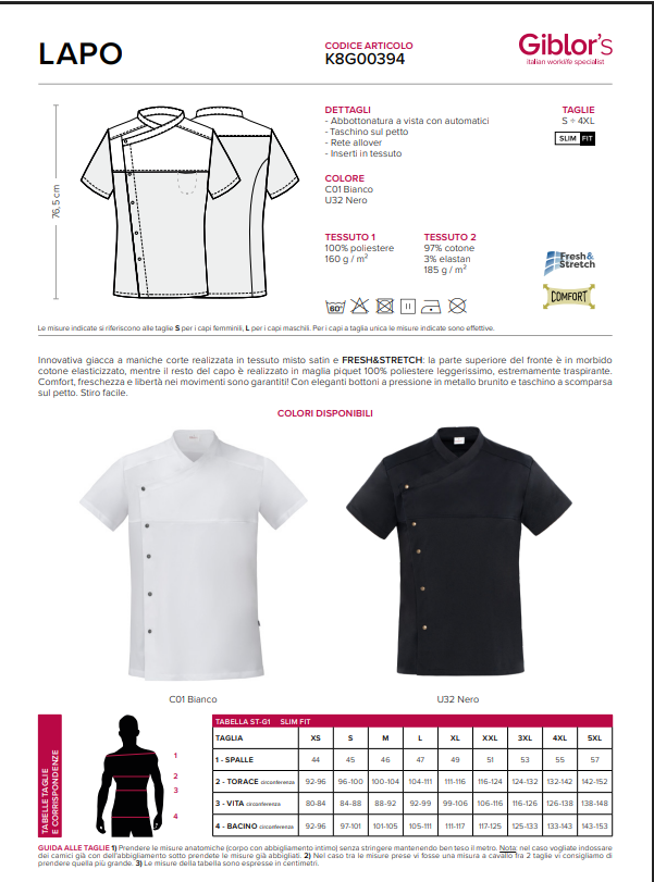 1. CHAQUETILLA COCINA M/C TEJIDO PUNTO ELASTICO  LAPO AJUSTADA 97%ALGODON 3%ELASTAN